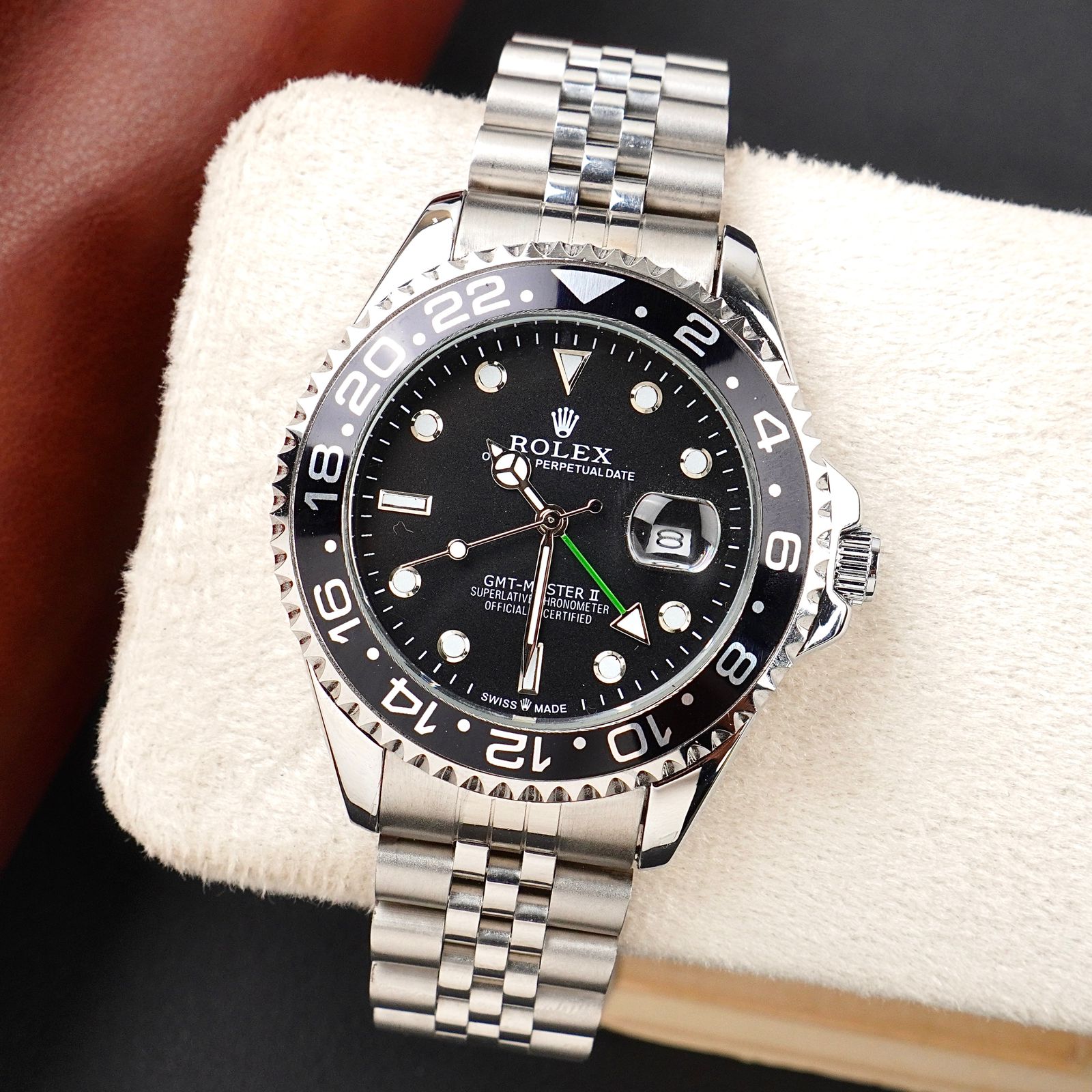 Experience the timeless aesthetic of the world’s most famous pilot’s watch without the five-figure price tag. This GMT-inspired timepiece captures the sleek, professional look of the classic black-ceramic traveler's watch, featuring the iconic green GMT hand and a high-polish finish.